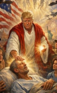 Later, according to CRUX, “Trump posted a picture suggesting he had saint-like powers akin to those of Jesus Christ. Wearing a biblical-style robe, Trump is seen laying hands on a bedridden man as light emanates from his fingers, while a soldier, a nurse, a praying woman and a bearded man in a baseball cap all look on admiringly. The sky above is filled with eagles, an American flag and vaporous images.”